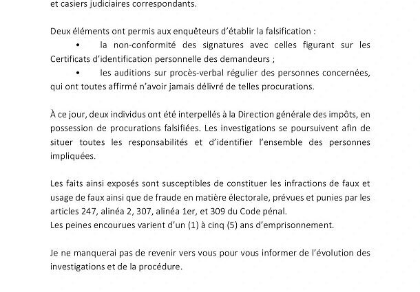 To date, two individuals have been arrested at the General Directorate of Taxes while in possession of falsified proxies. “Investigations are continuing to determine all responsibilities and identify all individuals involved,” stated Prosecutor Metonou, suggesting the network may be more extensive than initial arrests indicate.