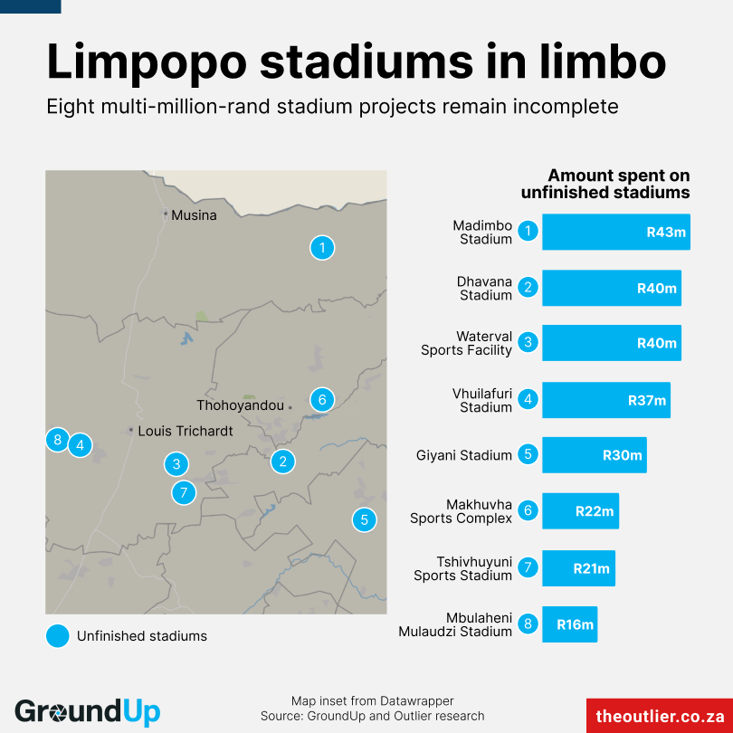 The pattern repeats across municipalities. The Waterval sports facility (R40 million) near Elim stands incomplete and unused for eight years under Makhado Municipality’s watch. The Giyani Section E stadium (R30 million) began ten years overdue, with municipal funds exhausted and a spokesperson noting there was “no need for security, as nothing remains to be destroyed”—a chilling admission of complete project failure.